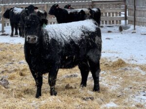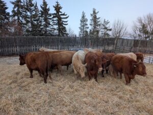 These are home raised Angus/Limousin heifers. They have been pail fed and are quiet to work with and to walk around. Annually they are vaccinated with Bovi – Sheild Gold and for blackleg. They have regular application of Biamectin pour on in the fall. They are bred to a red Angus bull, turned out on June 5 to September 20 / 2025